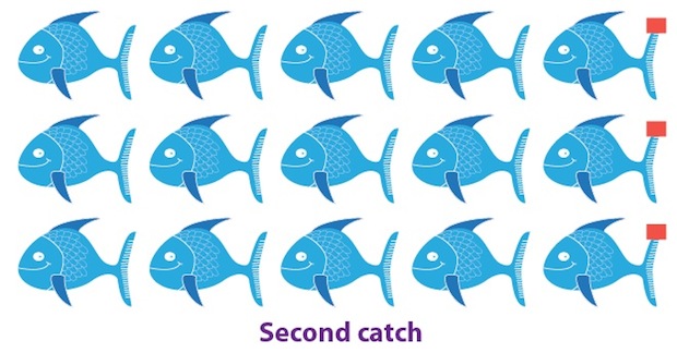 Next, after allowing sufficient time for the tagged fish to become reacquainted with their friends, you make a second haul of fish. Let's suppose this time you catch 1500 fish, of which 300 are tagged.