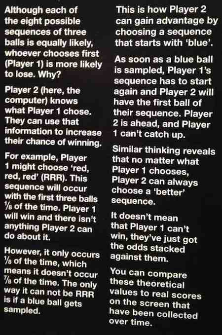 The Mathamazing version consists of a barrel containing Red and Blue balls. The visitor punches buttons to choose a three-ball sequence and then the computer chooses its sequence; the balls are then drawn at random until either the visitor's or the computer's sequence appears, and the winner is declared. The computer keeps a running tally of its success rate.