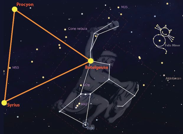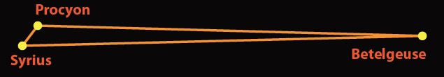 Much more interesting is the Winter Triangle, consisting of Sirius, Procyon and Betelgeuse, three of the brightest stars in the sky. Our top picture shows the Winter Triangle, which appears very close to equilateral, tickling Orion's armpit. (To avoid having Orion stand on his head, we've shown the constellations as they appear in the Northern Hemisphere.)