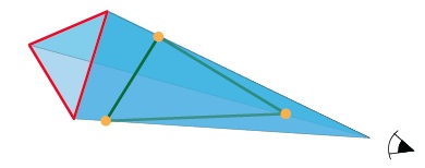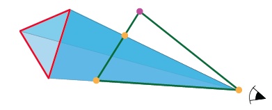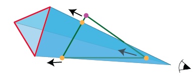 If we began with a sufficiently thin pyramid then one troublesome corner of the triangle will stick out beyond the pyramid. To try to fix this, we now slide the other two triangle corners along the sight lines.