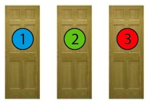22. If you choose four points in the plane, there are six distances between the various pairs of points. However, for a square there are actually only two distinct distances. Can you find another way to choose the points so there are only two different distances? And another? 23. A riffle shuffle of a deck of cards works as follows: the top half and the bottom half of the deck are separated, and then the cards are interleaved as shown in the diagram. Suppose you start with the deck arranged in a certain order, and you keep riffle shuffling, always with the bottom half of the deck (the red cards in the diagram) contributing the lower cards in the riffle. How do you know that the deck will eventually return to the starting arrangement? If you use a deck of 10 cards, how many shuffles does it take to get back to the beginning? 24. You have a pear and an apple. You're not hungry, so you pass the time seeing how a loop of wire can lie snugly along the surface of the apple. Must one of those wire loops, without any further bending, also lie snugly on the pear? 25. You appear on a TV game show, where you are given the choice of three doors. Behind one door is a brand new Ferrari, and behind the other two doors are man-eating Bengal tigers (cousins of QED cat). You pick Door 1, and your host, Simon the Likeable, opens Door 2, revealing a tiger. Beating away the tiger, Simon makes you an offer: "If you wish, you may switch your choice from Door 1 to Door 3." Should you? 26. The weird purple curve below is actually a loop that never runs into itself. Part of the curve is hidden under the blue square. Once the square is removed, will it be possible to draw a path that connects the two orange points without running into the purple curve? 27. As a magical Christmas present your father gives you infinitely many boxes, labeled 1, 2, 3, 4 and so on. Your mother's present to you is a set of "wooden fractions": one block in the shape of each fraction between 0 and 1. Unfortunately each box is only big enough to hold one fraction. Do you have enough boxes for all the fractions? 28. The Maths Masters have invited you to play a game. The game uses three dice, with sides numbered as follows: