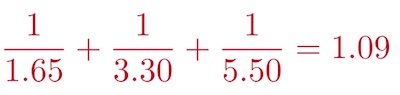 That 1.09 indicates that betting a total of $109 on the three possible outcomes (in just the right proportions) will guarantee you a return of exactly $100, no matter how the series unfolds. Then, the extra $9 you are required to wager indicates the extent of the rigging. (As part of the puzzles below, we indicate the way to determine the exact bets involved).