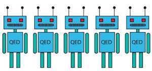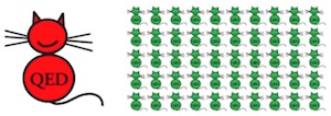 Medium 1. Kylie and Dannii ran a 100 metres race, and Kylie won by 5 metres. They plan to run a second race, with Kylie beginning 5 metres behind the starting line. Assuming both run the same speed as in the first race, who will win? Medium 2. A litre of paint is required to paint a 4 metre high statue of QEDcat. How many litres do you need to paint 50 statuettes of QEDcat, each 20 centimetres high? Medium 3. Begin with a square of length 2, and draw an octagon inside it, as pictured. Now draw a regular 16-sided polygon inside the octagon, and so on. What is the area trapped inside all the polygons? Medium 4. A forest outside Melbourne is inhabited by wild QEDcats. One day you catch 30 QEDcats. You tag their ears, and set them free. The next day you catch 20 QEDcats, of which 2 have tagged ears. How many QEDcats do you estimate inhabit the forest? Medium 5. You have ten large sacks of coins, but one of the sacks contains counterfeit coins. The real coins weigh 20 grams each and the counterfeit coins weigh 15 grams each. You have a scale with which you can weigh any number of coins. Using just one weighing, how can you tell which is the sack of counterfeit coins? Medium 6. Replace the letters Q, E, and D by different digits to make the following equation true.