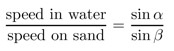 With a deeper analysis, you calculate that the fastest path is somewhere between the extreme paths above. The angles α and β that pin down the bend of this special route are determined by Snell’s Law, the same law that governs the way light bends when it moves from air to water: