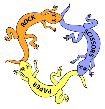 The cyclical nature of RPS is intriguing, and even more intriguing is the fact that such cyclical competitions exist in nature. As reported in the journal Nature, the biologists Sinervo and Lively investigated a species of blotched lizards in the Californian desert. They observed that blue-throated males defend a territory large enough for just one female. These blue males are dominated by orange males, which control large territories with many females. But, in turn, orange males are susceptible to invasion by yellow males, whose markings mimic those of females. To complete the cycle, once yellow males are common, they are vulnerable to the single-minded blue males. The result is an on-going game of RPS, with cyclical population patterns.