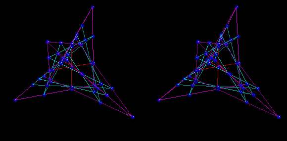 This animation will take a quite a while to load. It shows a spatial model of the generalized quadrangle of order (4,2). Embedded in this model is a model of the generalized quadrangle of order (2,2) and a Schlaefli double-six. The 15 lines in the generalized quadrangle of order (2,2) are the 12 purple and the 3 red lines. The lines of the double six are the remaining 12 lines in the model.