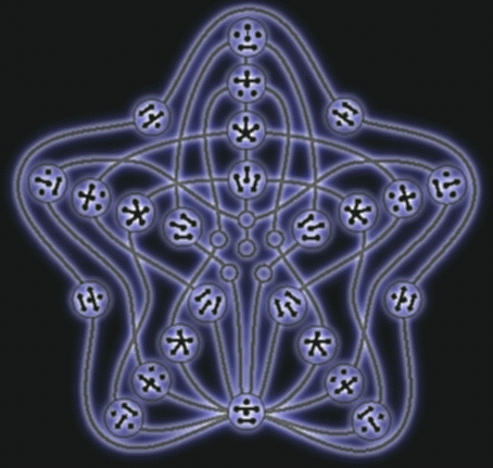 | The points of the plane are the 6 distinguished points in the middle of the diagram plus the 25 points that look like buttons. The 6 distinguished points form an oval in the projective plane, the buttons that contain isolated points are the 10 exterior points of the oval and the remaining buttons the interior points of the model. The 31 lines are generated by the 7 curves by rotating the diagram five times (72 degrees at a time). Note that the line which looks like a star fish also contains the point in the center of the diagram. Can you figure out which of the curves correspond to the tangents, the secants and the exterior lines of the oval? |
